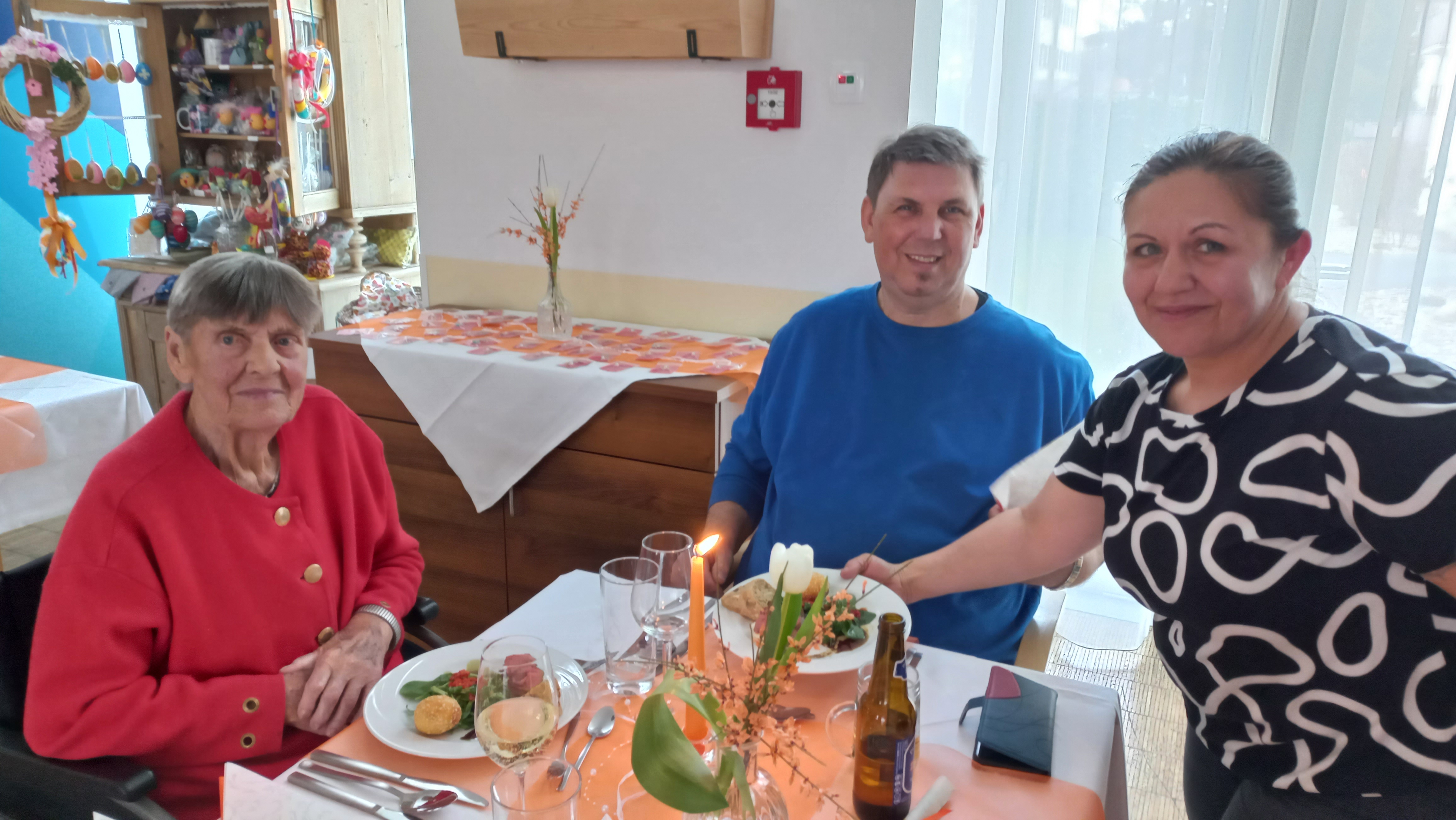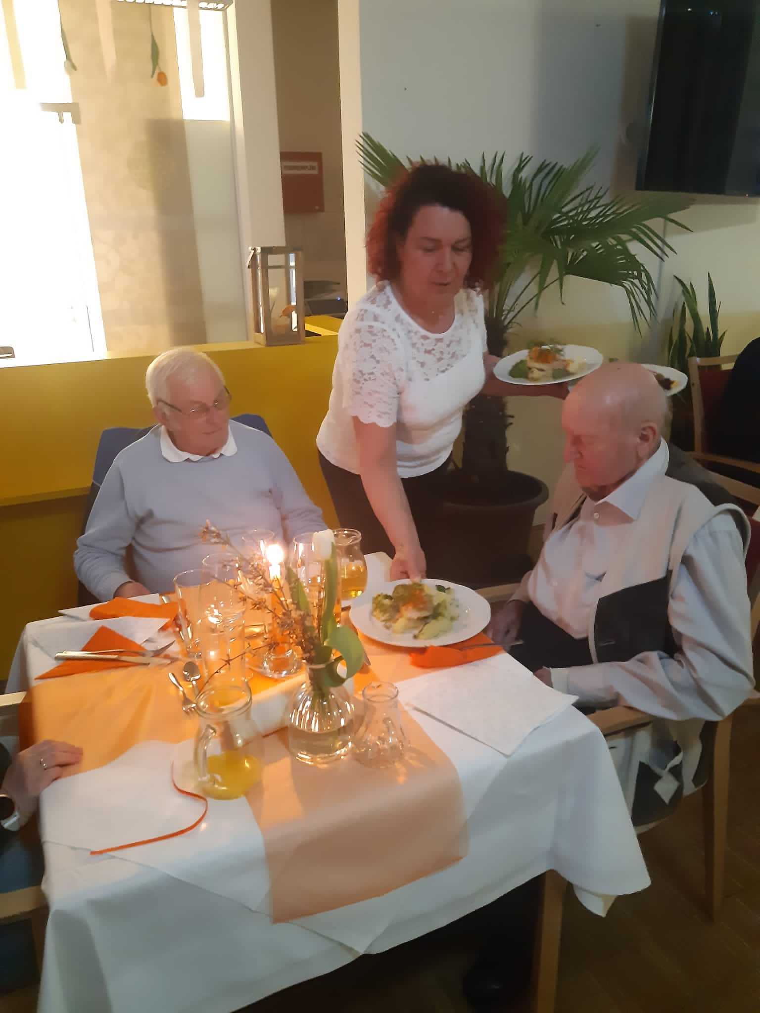 Alle Jahre wieder im März, auch heuer fand im SeneCura Sozialzentrum Stainz ein besonderer Abend statt – das „Candle Light Dinner“. Ein besonders edler Rahmen, der unseren Angehörigen mit ihren lieben Bewohner:innen geboten wird, einige schöne gemeinsame Stunden zu verbringen. Heuer wurden die Farben orange und weiß gewählt und auch die Dekoration des Raumes wurde auf dieses Ereignis hin abgestimmt. Elegante weiße Tulpen mit orangen Ginster verzierten die Tische und die orangen Stabkerzen verströmten ein warmes Licht, wodurch eine stimmungsvolle Atmosphäre entstand. Gemeinsam halfen das EA- und SeneCura-Team zusammen, um diesen schönen Rahmen so stimmungsvoll wie möglich zu gestalten. Nach der herzlichen Begrüßung durch die Hausleitung Kathrin Hopfer und Pflegedienstleitung Isabella Antensteiner wurde der Abend eingeläutet.