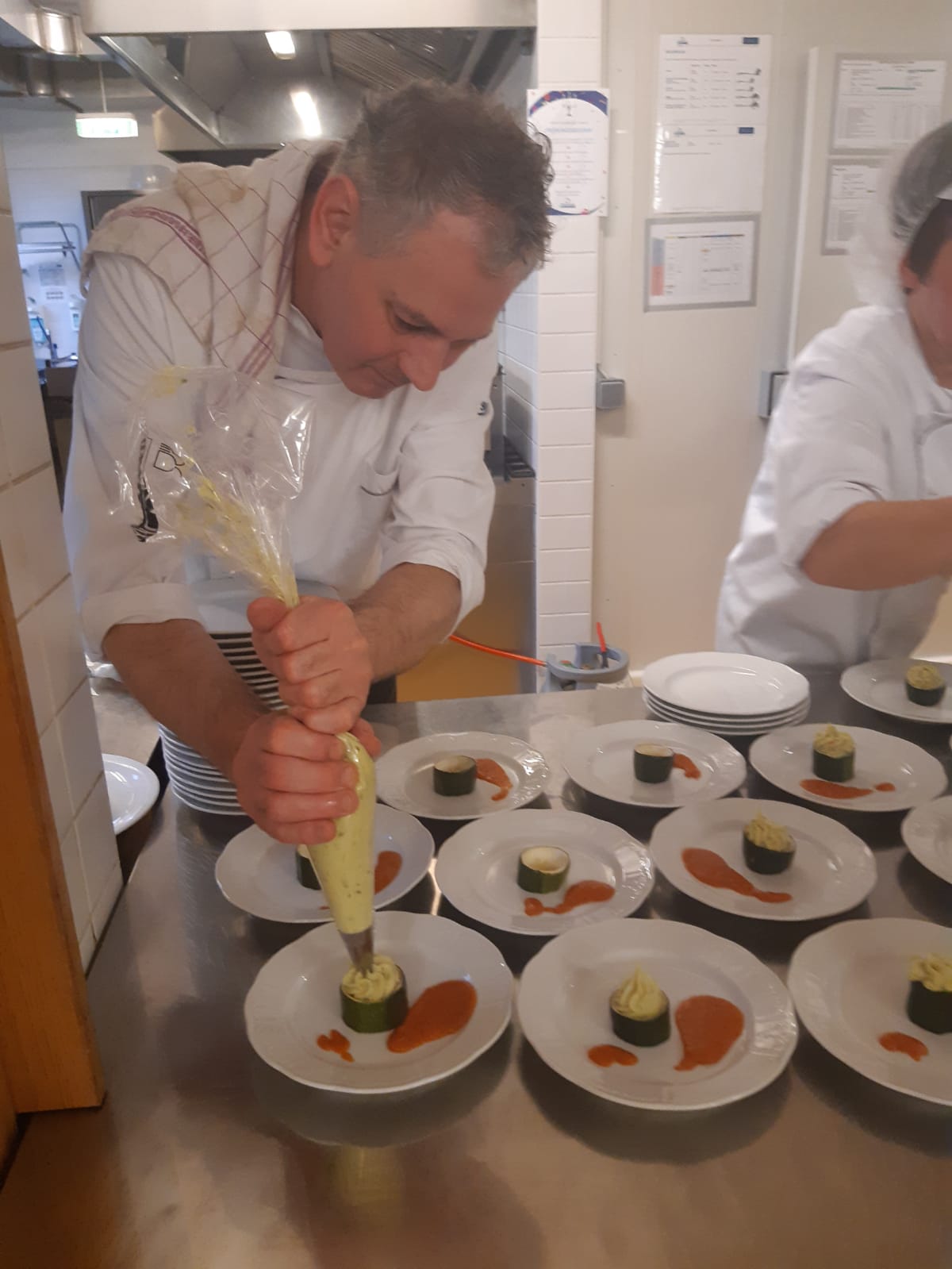 Ein fünfgängiges Menü wurde von Küchenchef Heinz Oswald sorgfältig zusammengestellt und mit seinem Team für unsere Gäste auf den Punkt zubereitet. Den Anfang machte die Vorspeise Roastbeef-Röschen auf gebuttertem Toastbrot an Rucola- Spinatsalat und frittiertem Sesam-Ei. Als Suppe gab es eine Bärlauch-Cremesuppe mit Röstbrot und darauf folgte der Zwischengang herzhafte Zucchinitürmchen mit gebratenem Schafkäse. Zur Auswahl der Hauptspeise gab es entweder Zweierlei vom steirischen Jungschwein mit Austernpilzen und Wildreis oder ein Lachsfilet mit Prosecco-Schaum auf Gemüsebeet und heurigen Kartoffeln. Den Süßen Abschluss machte die Dessertvariation Dreierlei Schokomousse mit frischen Früchten.