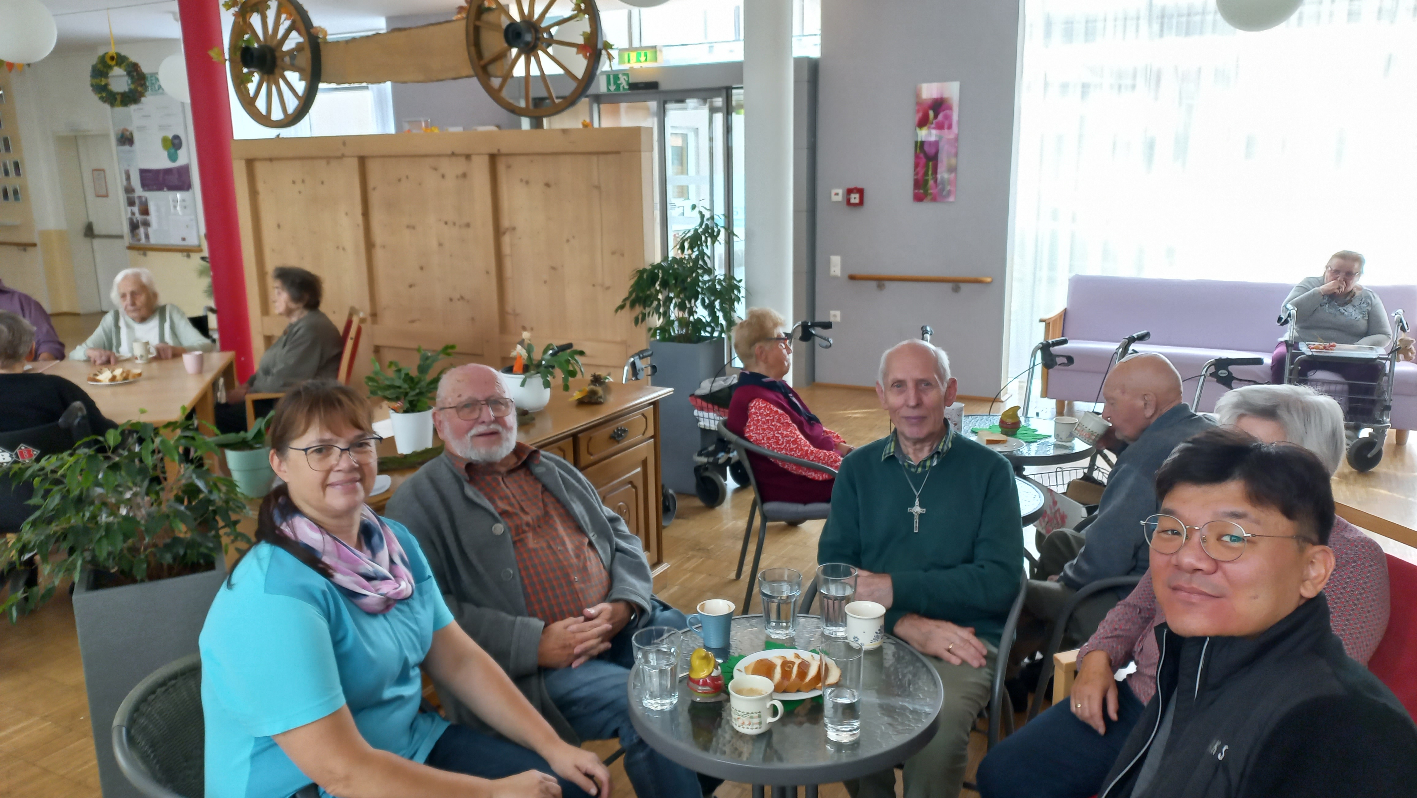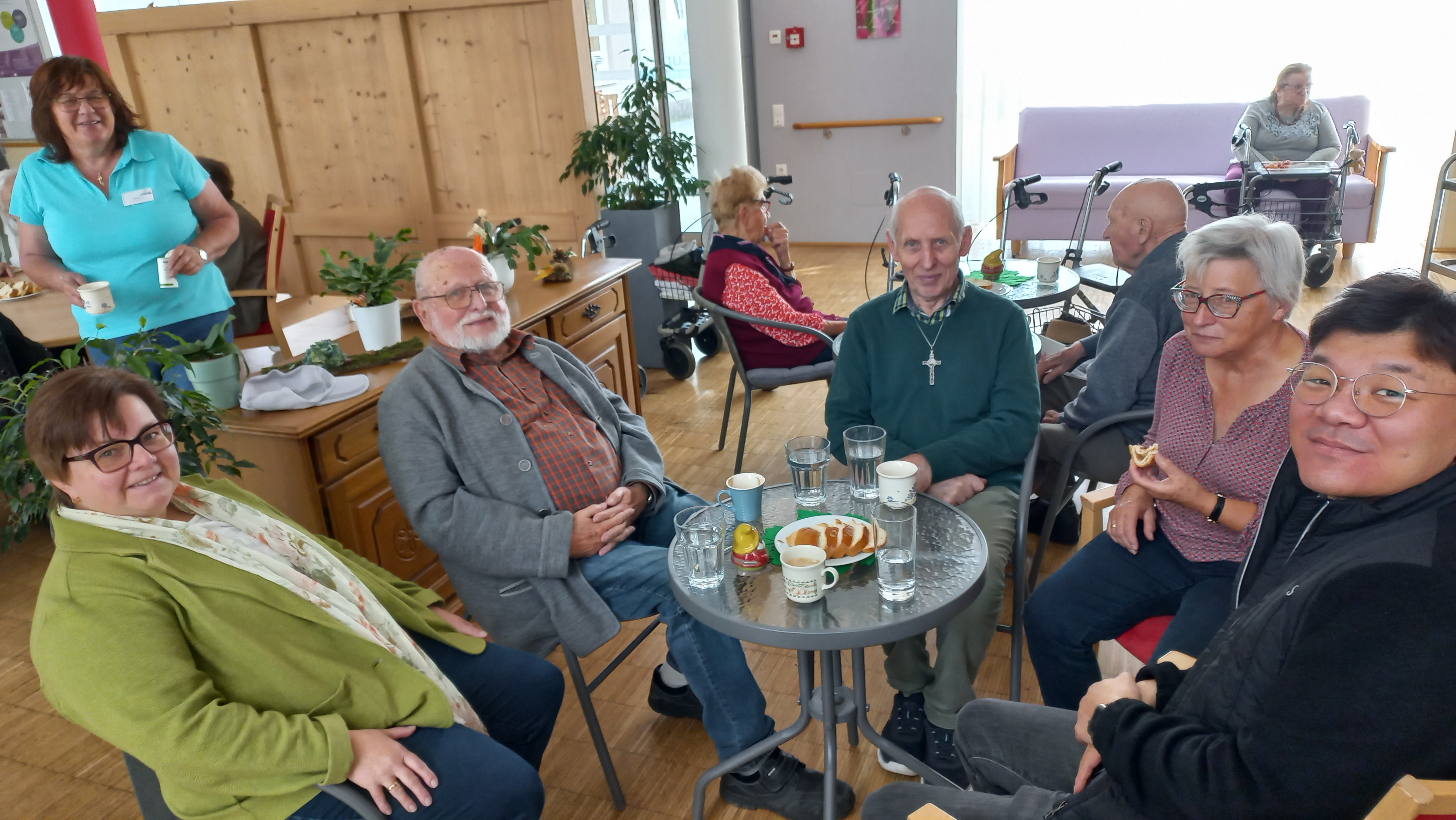 Schlussgesang war „Großer Gott wir loben dich“, der von den vielen anwesenden Bewohner:innen laut und mit großer Hingabe gesungen wurde. Im Anschluss gab es ein gemütliches Programm bei einer Agape mit Kaplan Kim Stephan, worüber sich die Seniorinnen und Senioren sehr freuten.