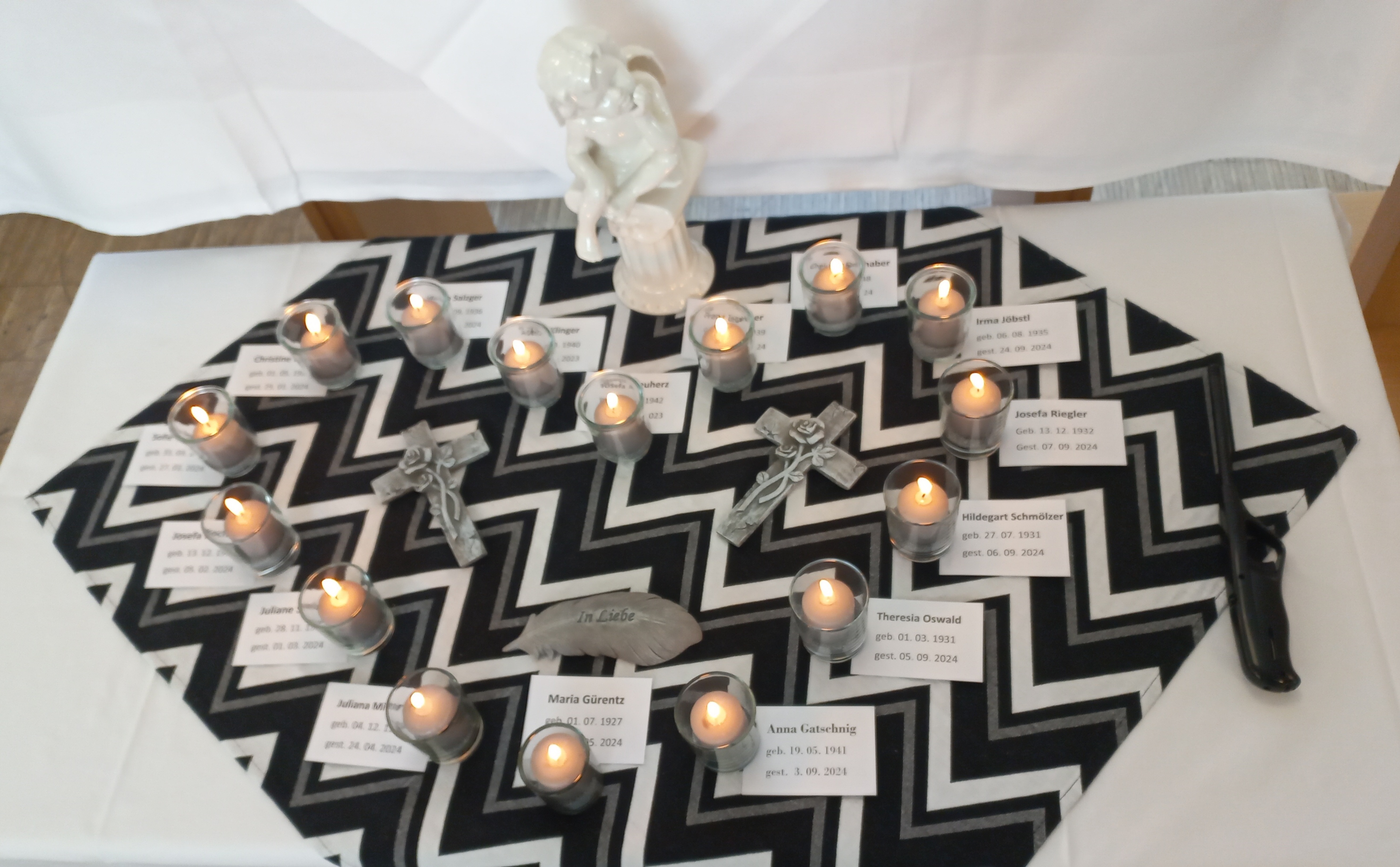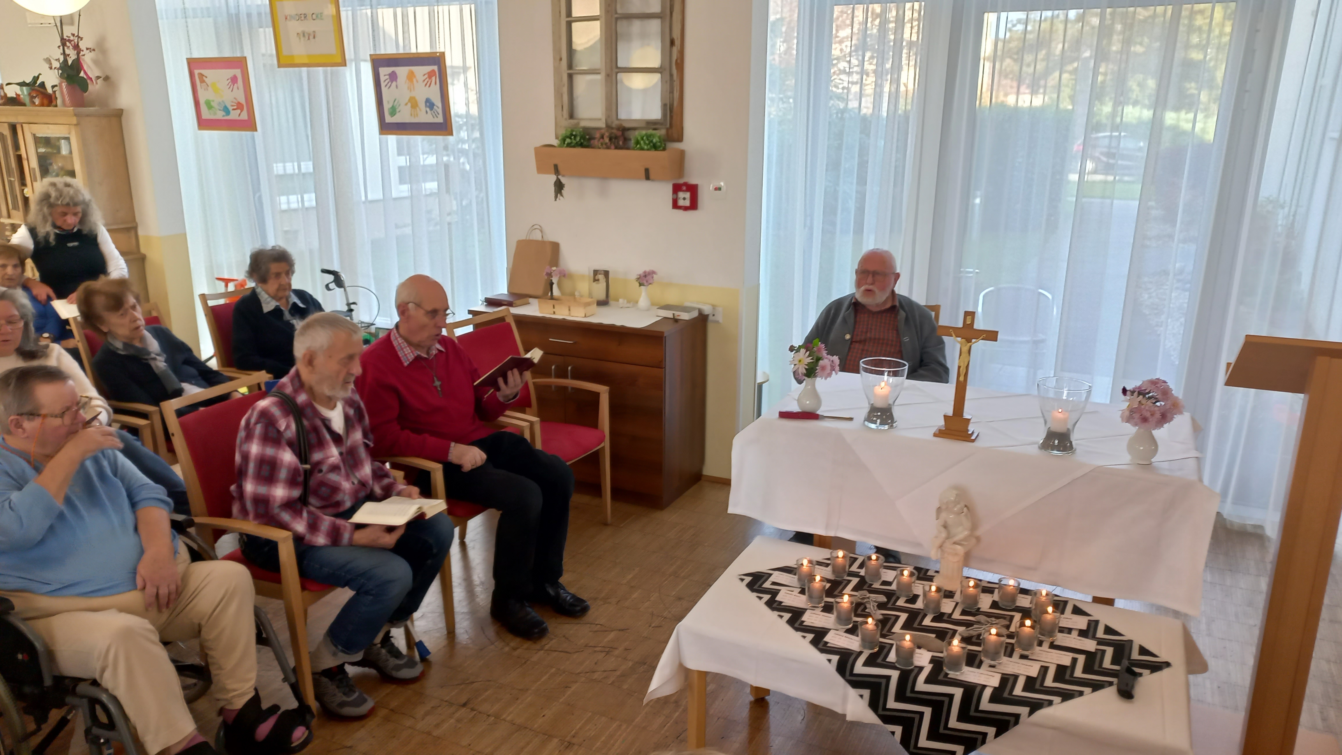 Zuerst wurde der Rosenkranz mit Lektor Franz Klement gebetet. Für die Einleitung bereitete Mitarbeiterin Franziska Hiden den Text „Das Leben ist wie eine Zugfahrt“ vor. In diesem Sinne stiegen nach und nach einige Bewohner:innen aus dem Zug des Lebens aus. Frau Ingeborg Ninaus, EAMA und Angehörige, die ihren Vater aus dem Zug des Lebens aussteigen lassen musste, entzündete für jede:n Bewohner:in eine Kerze. Danach wurde der Gedenkgottesdienst von Pfarrer Marius Enasèl sehr andachtsvoll gestaltet. Im Anschluss des Gottesdienstes bot sich die Gelegenheit, sich die Mitbewohner:innen wieder ins Gedächtnis zu rufen und zu erzählen, welche Erlebnisse man teilte.