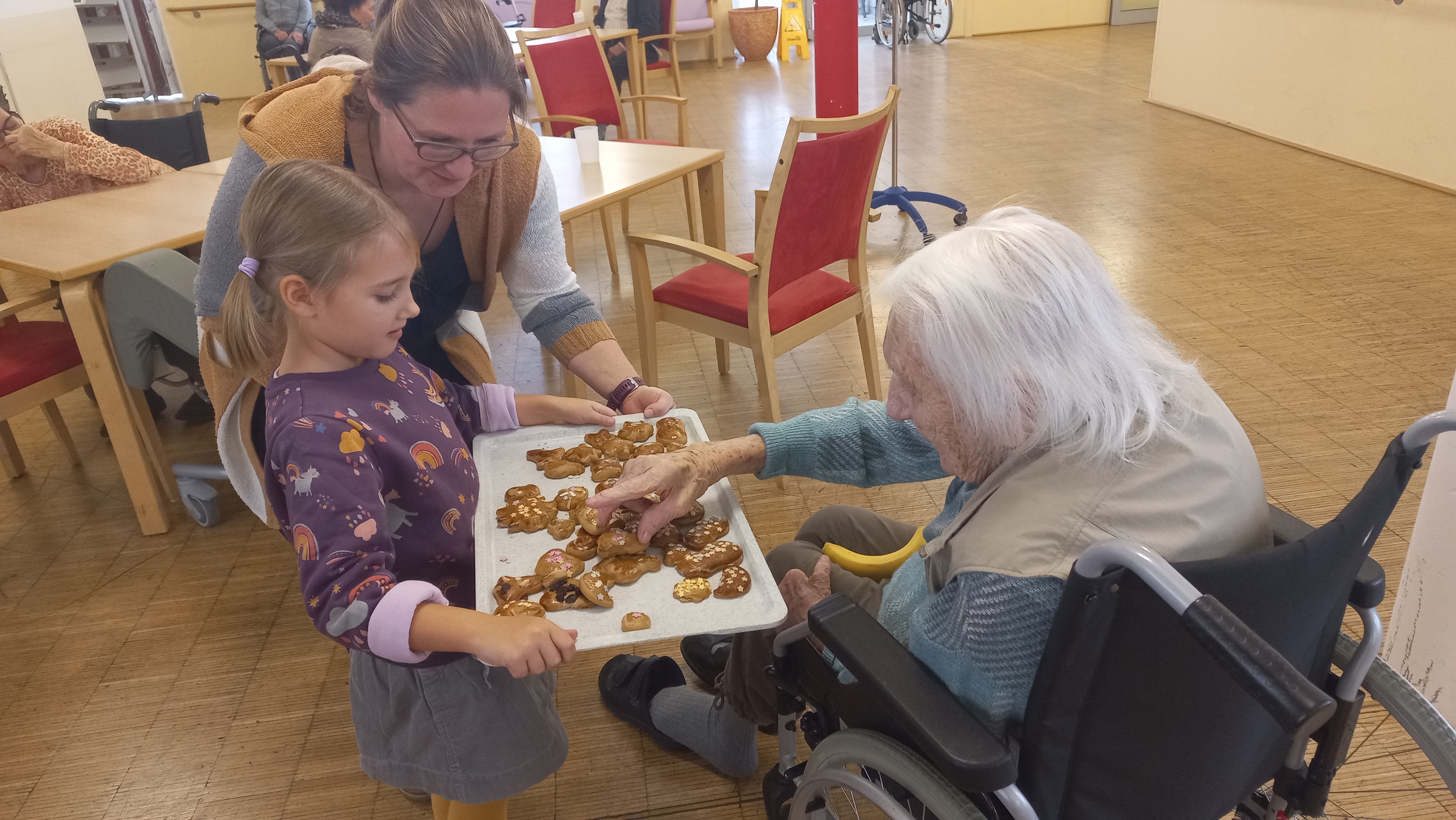 Im Advent gibt es viele schöne Aktivitäten, die den Advent im SeneCura Sozialzentrum Stainz näher bringen. Eine davon war das fröhliche Kekse backen mit dem örtlichen Kindergarten. Die Bewohner:innen freuen sich immer wieder auf den Besuch der Kindergartenkinder und können es kaum erwarten, was das Projekt „Jung und Alt“ diesmal für sie bereit hält. „Kekse backen“, Teige Kneten, ausrollen, ausstechen mit Ei bestreichen, mit verschiedenen Zuckerstreusel verzieren, goldbraun backen und das Wichtigste: Die Kekse verkosten. Eine kleine Stärkung wartete auf die flinken Helfer:innen bevor sie den Rückmarsch antreten. „Ein sehr schöner Vormittag, der viel zu schnell vergangen ist!“, sagte Herr Rumpf, der viele Aktivitäten begeistert zum ersten Mal mitmacht. Die Freude seinerseits war riesig. Das schönste in dieser Zeit ist, wenn Bewohner:innen sich freuen und ein Lächeln über ihre Lippen kommt.
