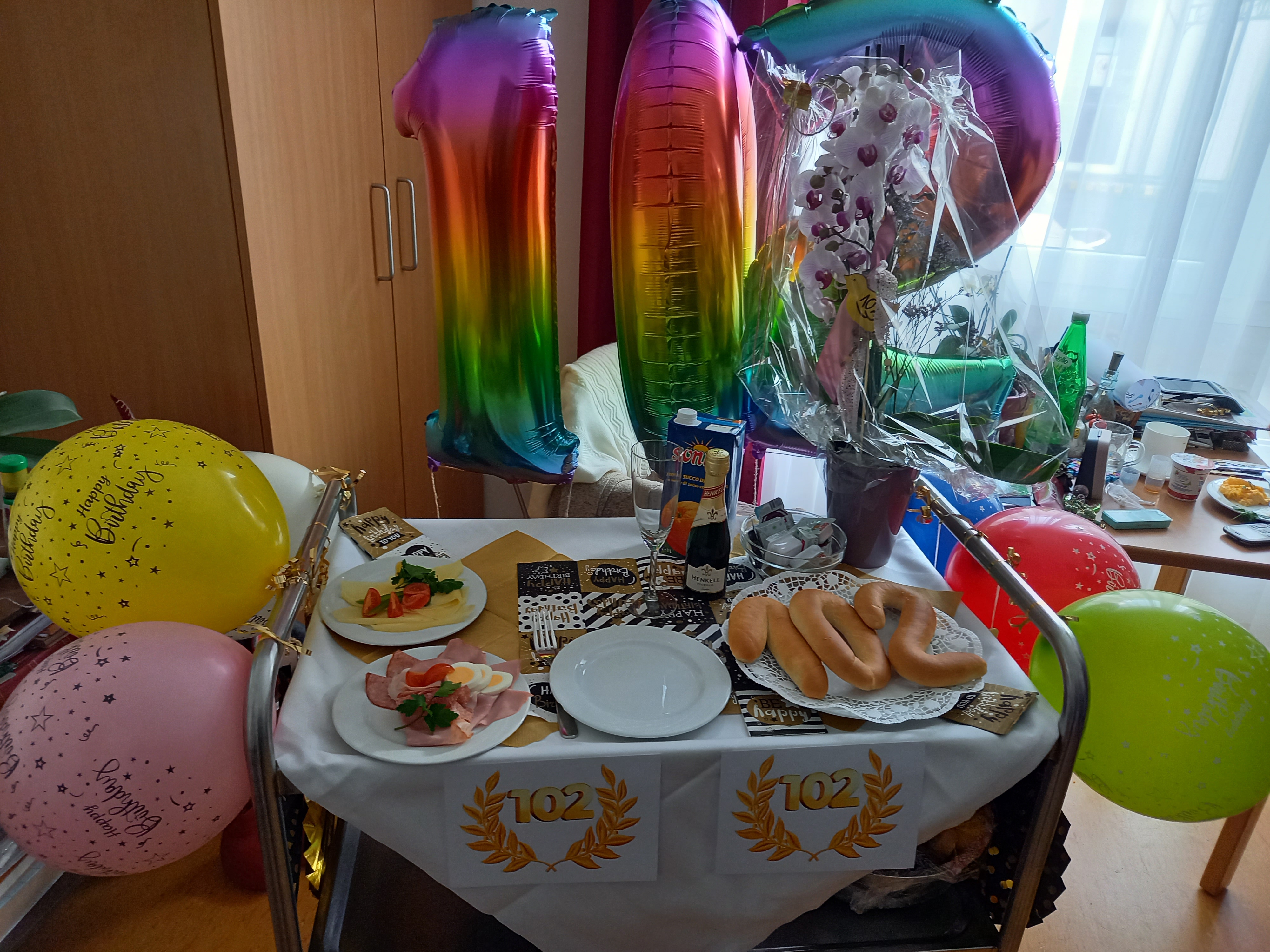 Frau Pototschnigg geht es gesundheitlich noch sehr gut und sie ist auch selbstständig unterwegs. Die Jubilarin wurde von dem Animationsteam am Sonntag mit einem Frühstücksbrunch im Zimmer sowie einer netten Deko überrascht.