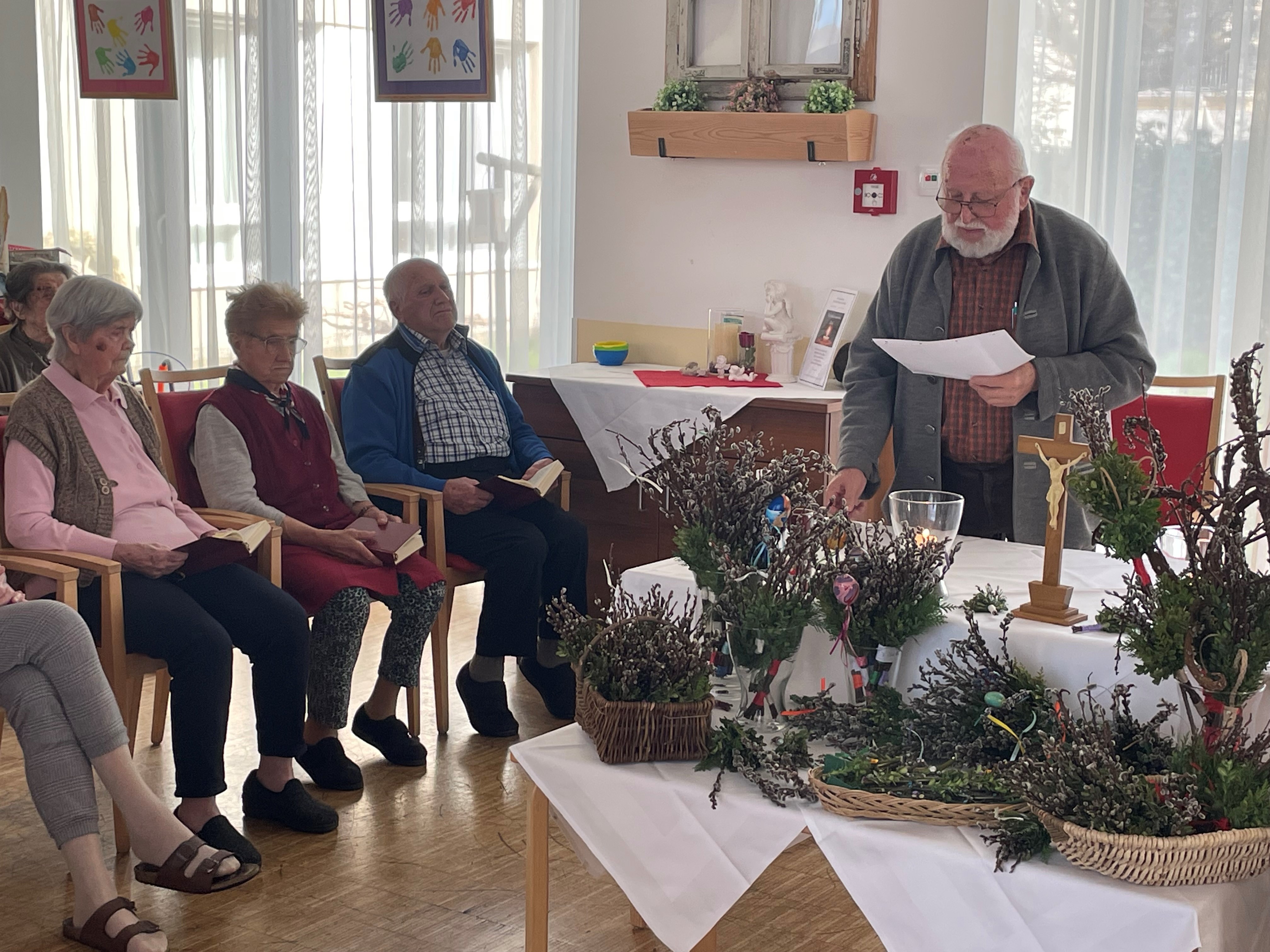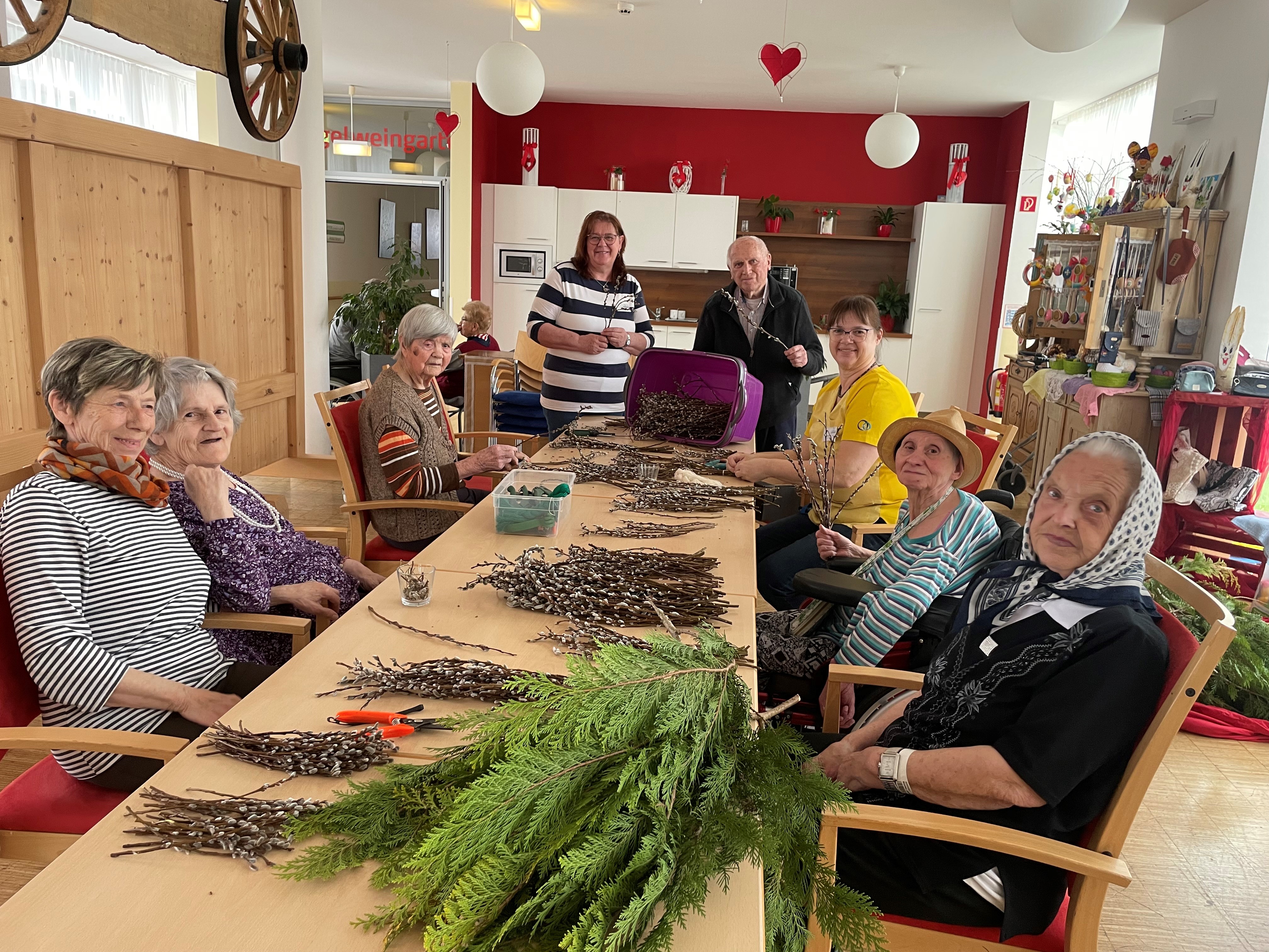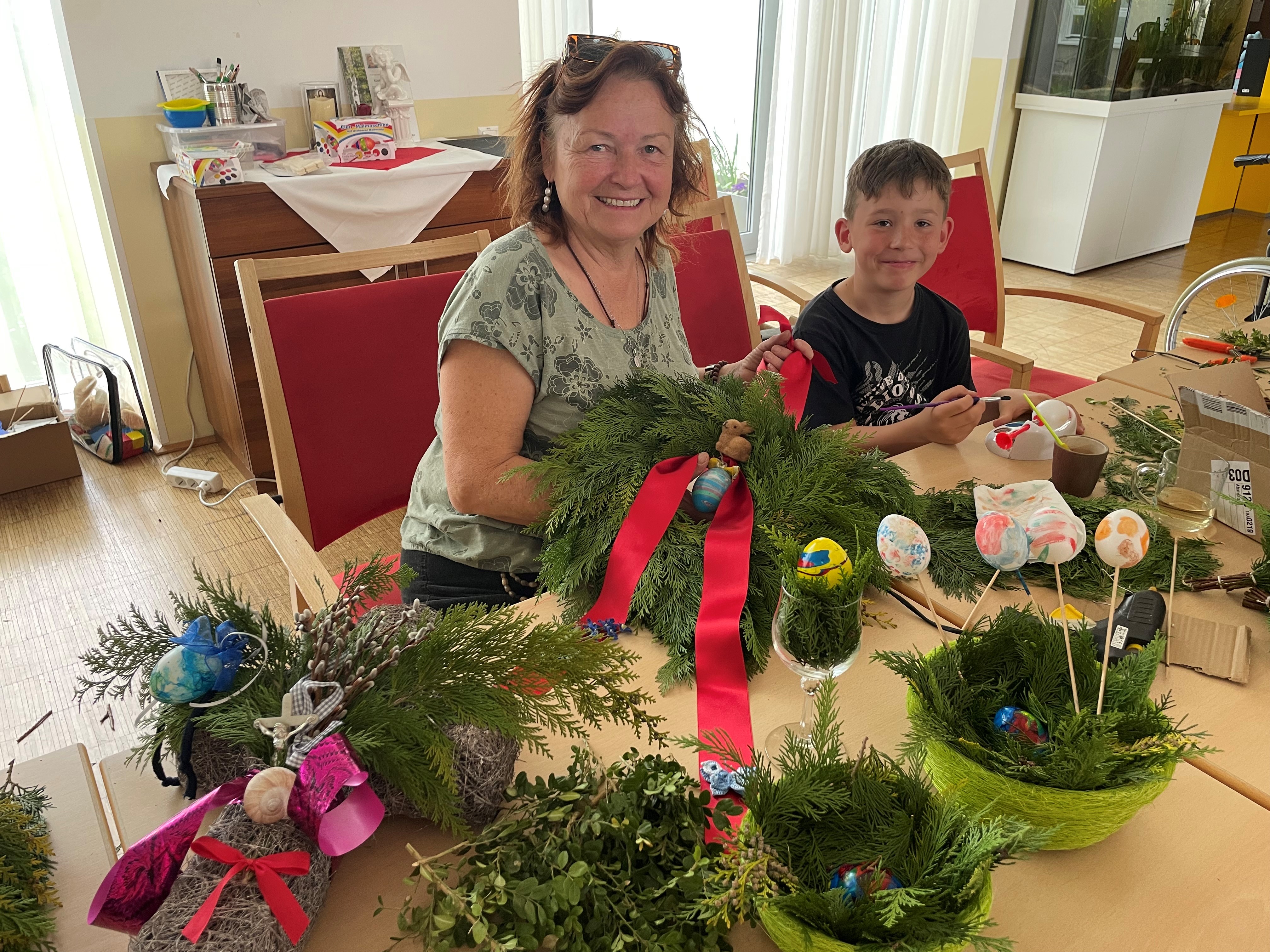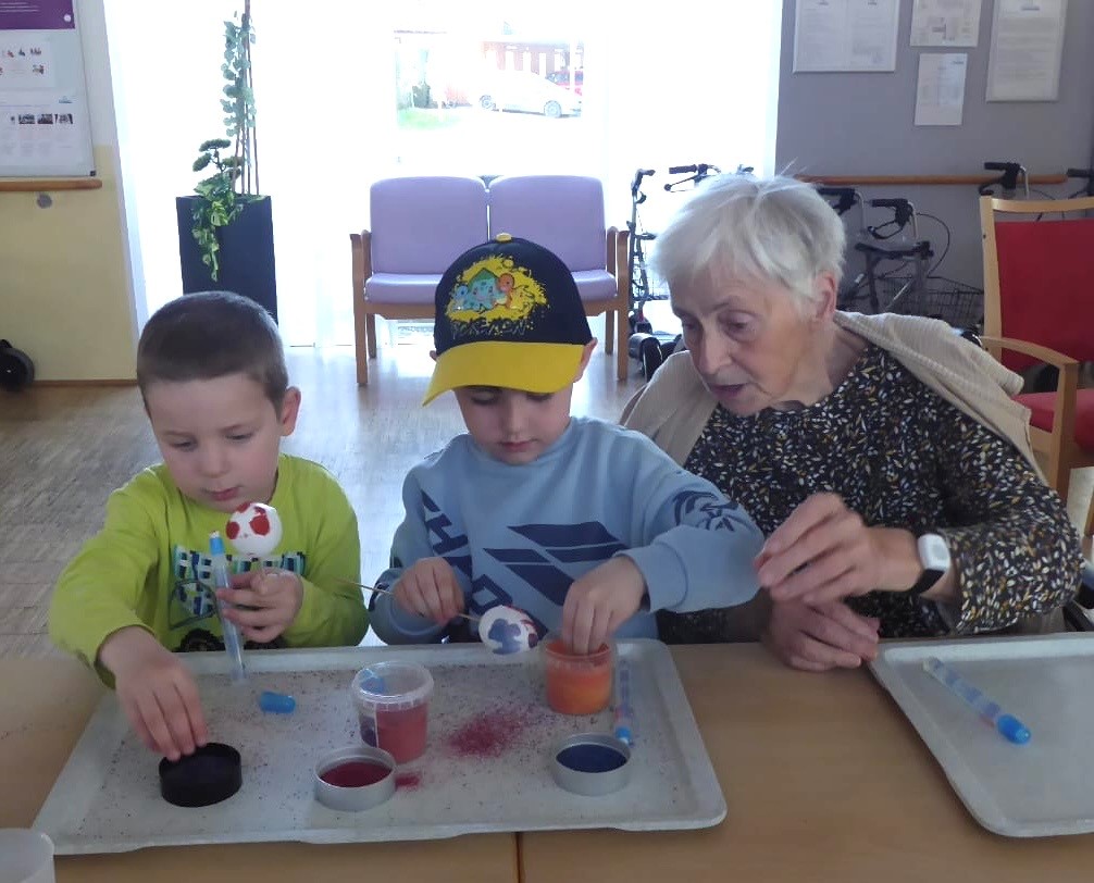 Beim Projekt „Alt und Jung“ gestalteten die Bewohner:innen des Hauses mit dem Kindergarten Stainz, Ostereier mit verschiedenen Techniken. Malen, Marmorieren, mit bunten Sand bekleben oder mit bunten Papierblumen bekleben – alles war erlaubt. Kurz danach stand das Palmbuschen binden mit Bewohnerinnen, Schüler Martin Possert samt Oma Maria sowie den ehrenamtlichen Mitarbeiter:innen am Programm. Der größte Palmbuschen wurde von Franz Rumpf für das Haus gebunden. Zudem erhielt jede:r Bewohner:in ihre/seine eigene Palm. Die Palmweihe wurde von Diakon Franz Hebenstreit gestaltet, an welcher viele Bewohner:innen teilnahmen. Über die geweihten Palmbuschen haben sich die Bewohner:innen sehr gefreut.