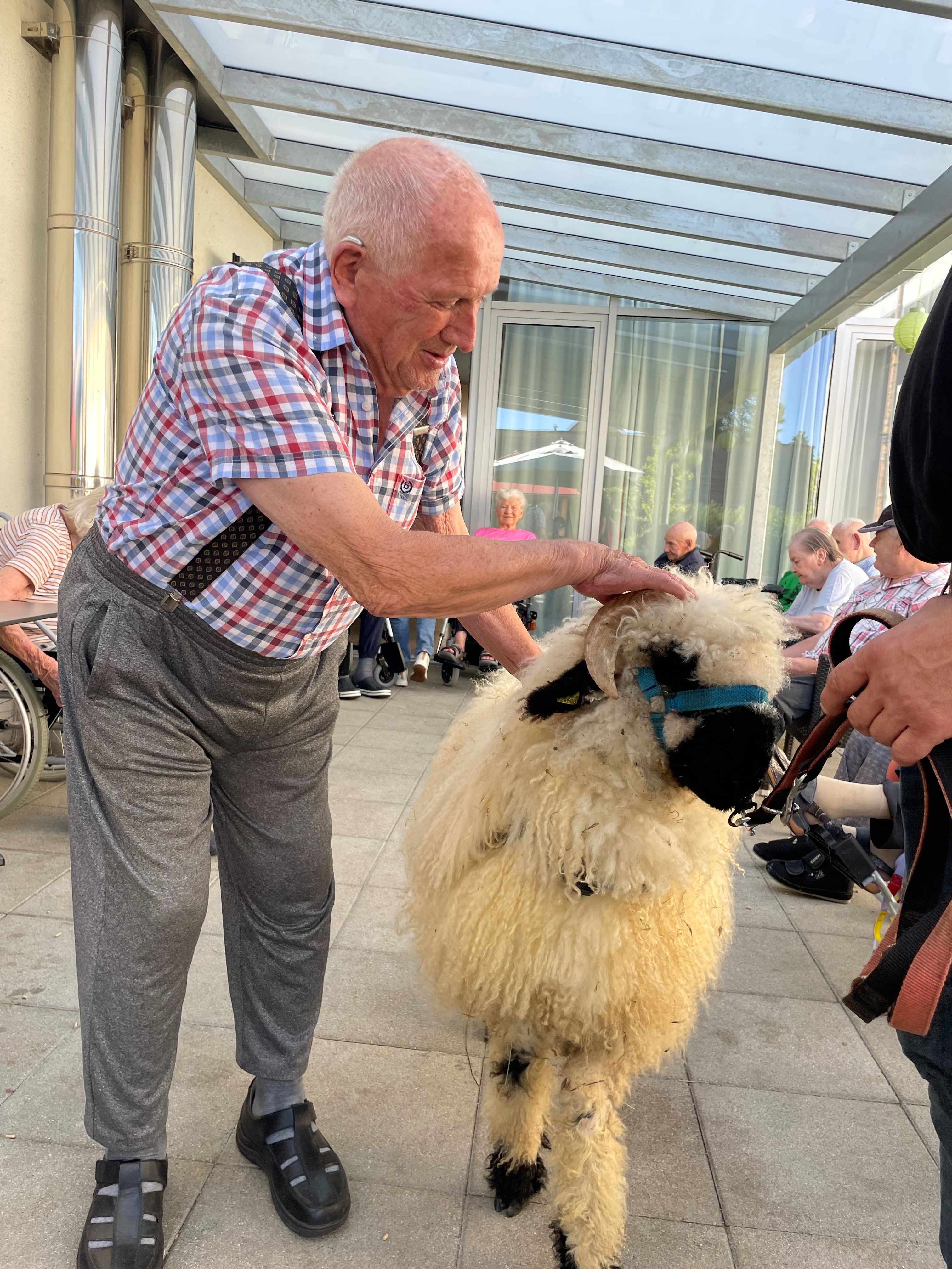 Tierischen Besuch bekam kürzlich das SeneCura Sozialzentrum Stainz. Gerhard Ganster, Sohn von Bewohnerin Annemarie Ganster besuchte die Einrichtung gemeinsam mit Schaf Charly, da es ihr nicht mehr möglich ist, die Schafe am Rosenkogel zu besuchen. Natürlich freuten sich auch die Bewohnerinnen und Bewohner des Hauses über den tierischen Besuch. Groß war die Vorfreude als sich alle gemeinsam im Garten versammelten und Schaf Charly um die Ecke kam. Die Bewohner:innen durften das Schaf füttern und streicheln.