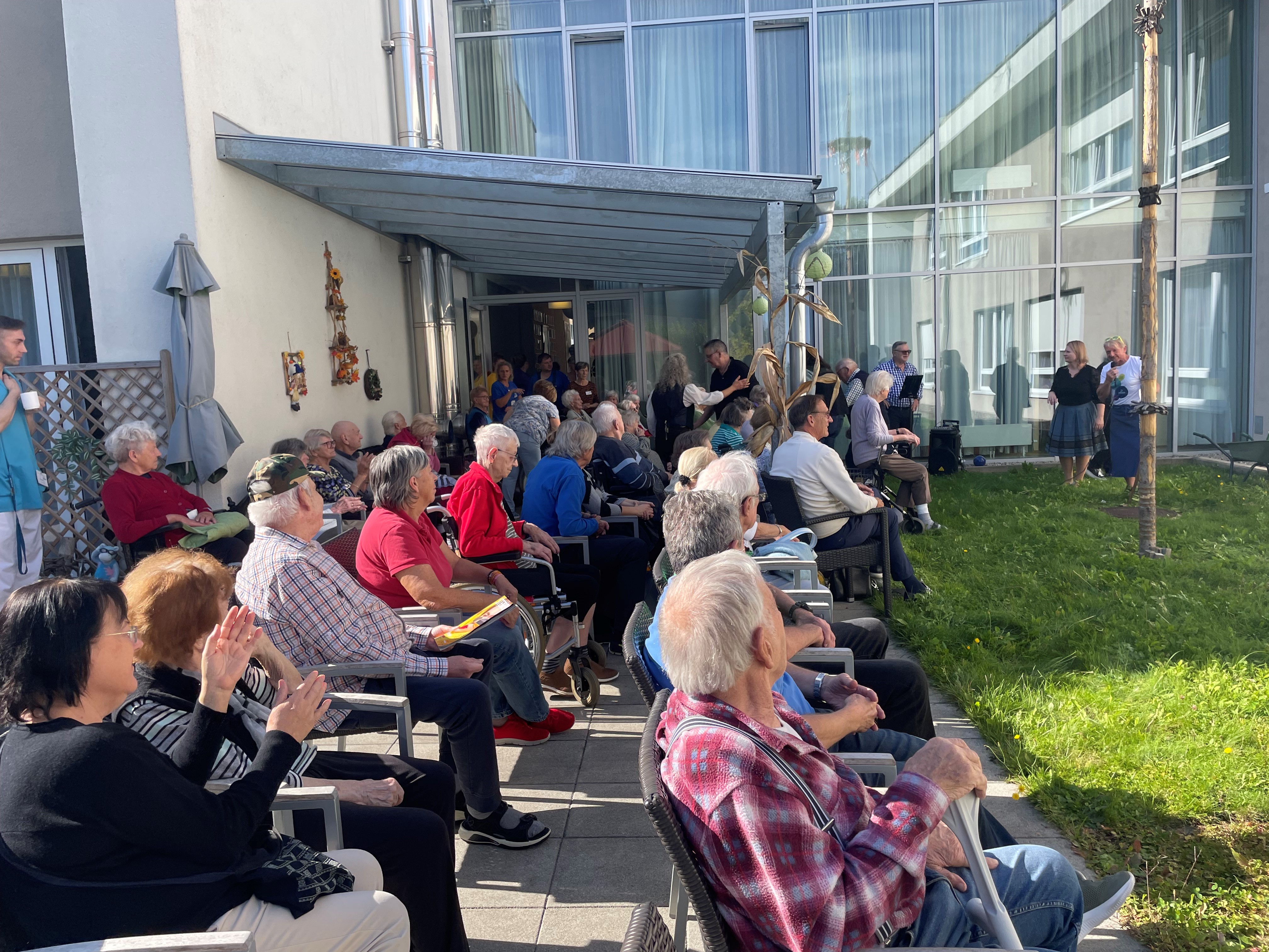 Am Freitag feierten die Bewohner:innen, Angehörigen und Mitarbeiter:innen des SeneCura Sozialzentrums Stainz ein ausgelassenes Oktoberfest. An diesem sonnigen und warmen Herbstnachmittag fanden sich alle Teilnehmer:innen im Garten ein, um nach einer kurzen Begrüßung den Maibaum umzuschneiden. Der Trompetenexpress gab den nötigen Rhythmus vor und die Gäste klatschten im Takt des Holzhackermarsches kräftig mit. „Achtung Baum fällt“, wurde mit einem kräftigen Applaus belohnt. Der Maibaum wurde dann in handliche Stücke gesägt, um beim Solidarity Projekt versteigert zu werden. – An dieser Stelle bedanken wir uns recht herzlich bei unseren Ehrengästen Hrn. Bürgermeister Karl Bohnstingl und Fr. Hilde Strohmeier, wo der Maibaum gekauft wurde. – Anschließend wurde zum Oktoberfest passend in den Farben weiß und blau, der dekorierte Speisesaal feierlich eröffnet. Dort gab es Kaffee und zahlreiche Kuchenvariationen. Das Musiker-Duo „Der Trompetenexpress“ brachte eine lustige und ausgelassene Stimmung in den Saal und verführte die Gäste zum Tanzen und Singen. Einer der Höhepunkte war dann sicher die Weißwurst, die klassisch mit Senf, Krenn und Laugenbreze serviert wurde. Gemeinsam wurde gegessen, gescherzt, gelacht und eine schöne Zeit miteinander verbracht. Bewohnerin Martha Dobreff meinte: „Es war so lustig, da habe ich meine Schmerzen ganz vergessen“.