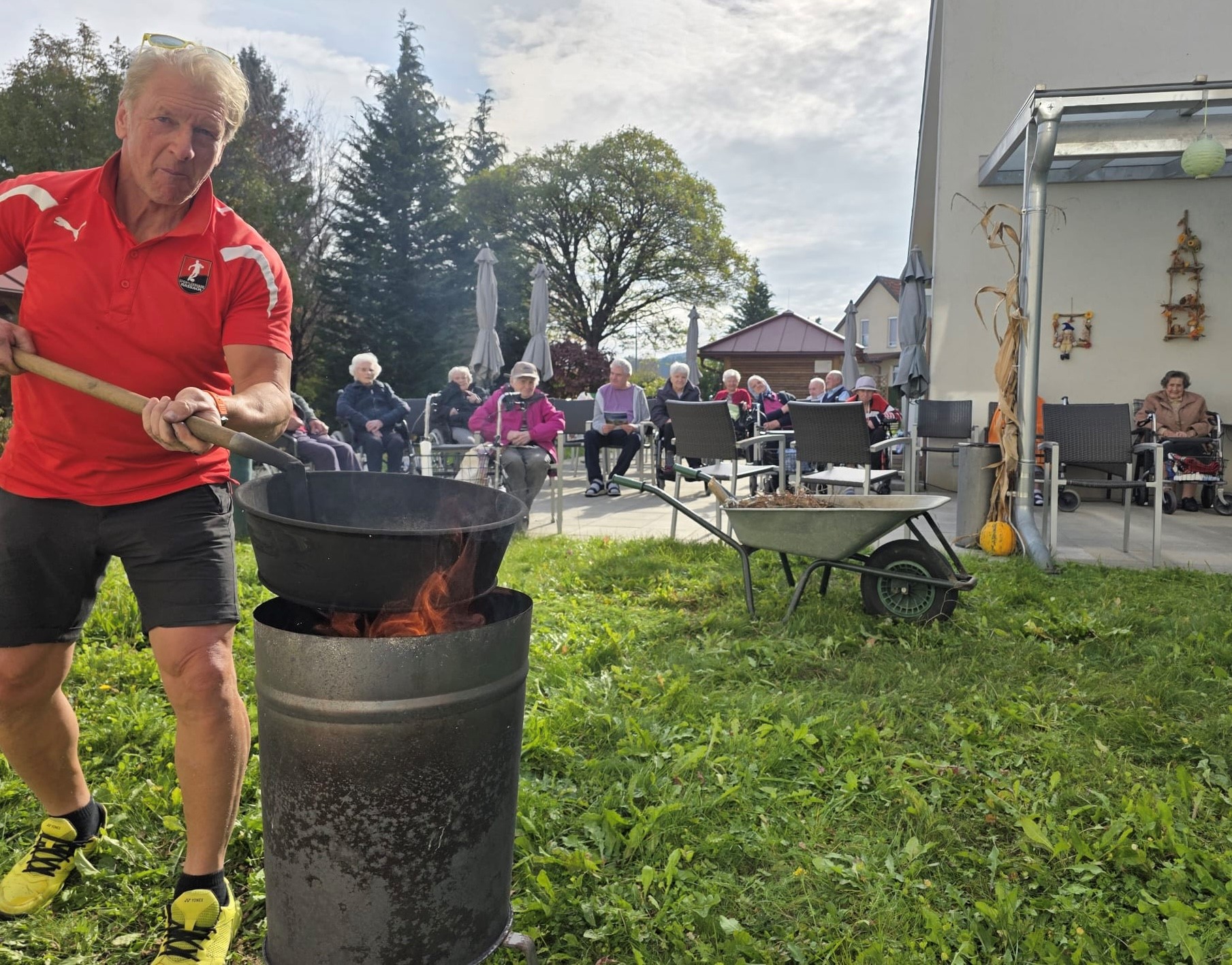 Unser Mitarbeiter Gerhard Wippel sorgte mit viel Engagement dafür, dass die Kastanien perfekt gebraten wurden. Immer mehr Bewohner:innen fanden sich im Garten ein, um den Duft des Rauches, die Wärme des Feuers und das vertraute „Schütteln der Kastanien“ zu genießen – Erinnerungen an frühere Zeiten wurden dabei wach.