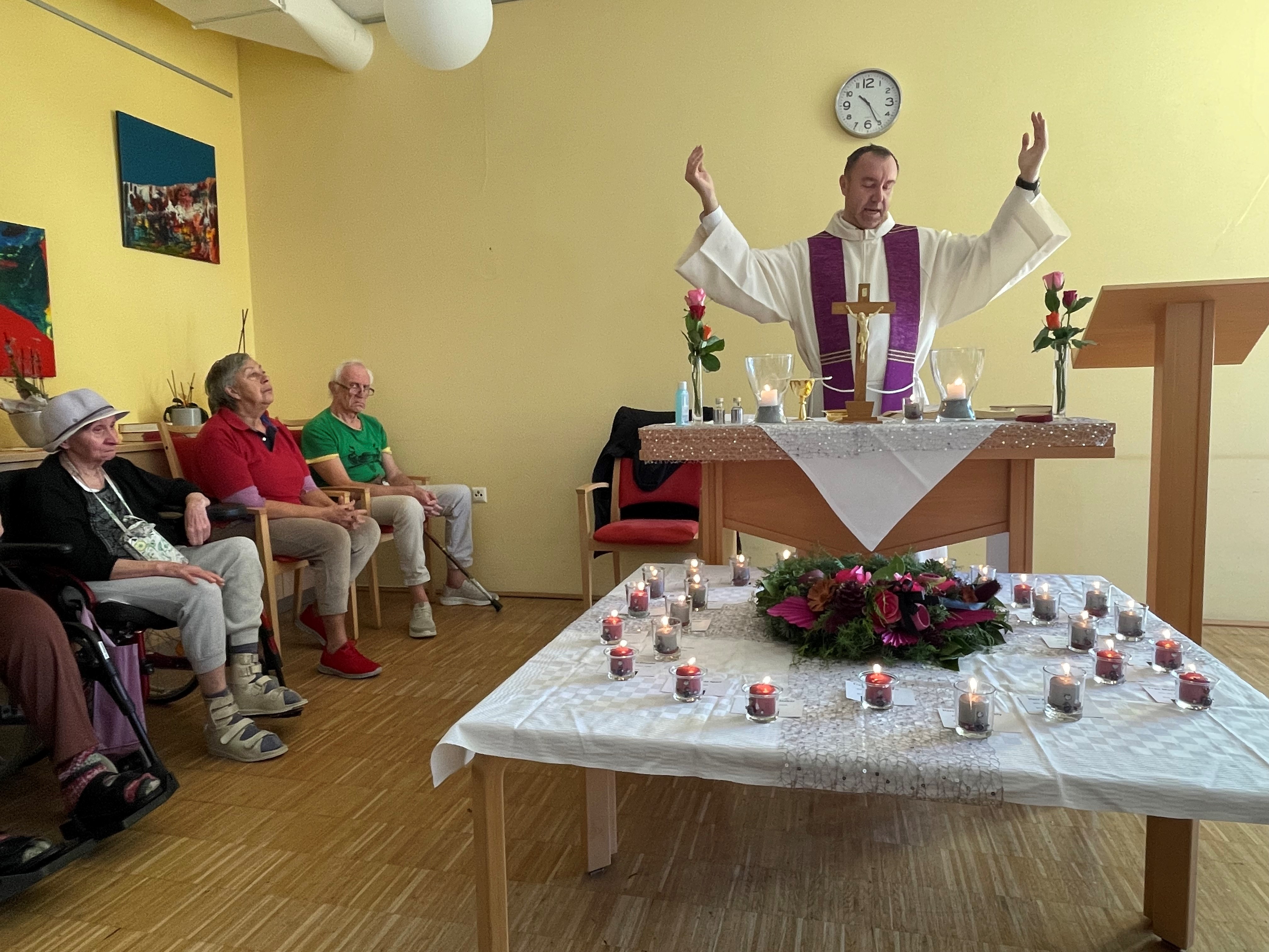 Am 4. November fand im SeneCura Sozialzentrum Stainz der diesjährige Gedenkgottesdienst statt. Pfarrer Lic. theol. Marius Enasèl gestaltete dabei eine Hl. Messe rund um das Gedenken der Verstorbenen des vergangenen Jahres. Mit dem Anzünden der Kerzen für jeden Verstorbenen erwiesen wir unseren Respekt der Verstorbenen. Das Licht der Kerzen symbolisiert die Hoffnung auf ein ewiges Leben. Die Bewohner:innen des Hauses waren von der Gedenkfeier ganz ergriffen und demütig.